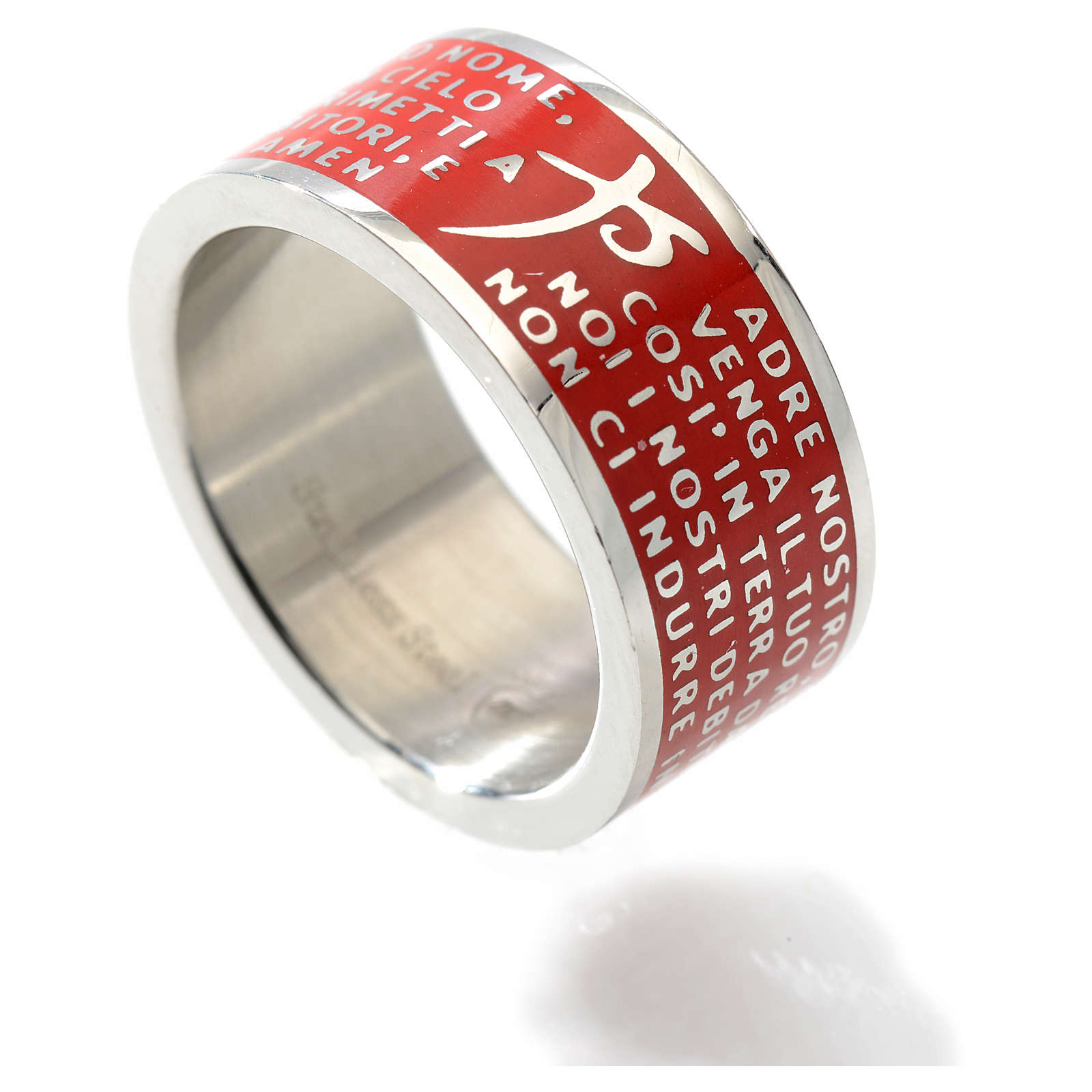Anel Pai Nosso ITA INOX LUX vermelho. Anel em aço inox 304 brilhante com esmalte vermelho e gravura em relevo da oração Pai Nosso em italiano.