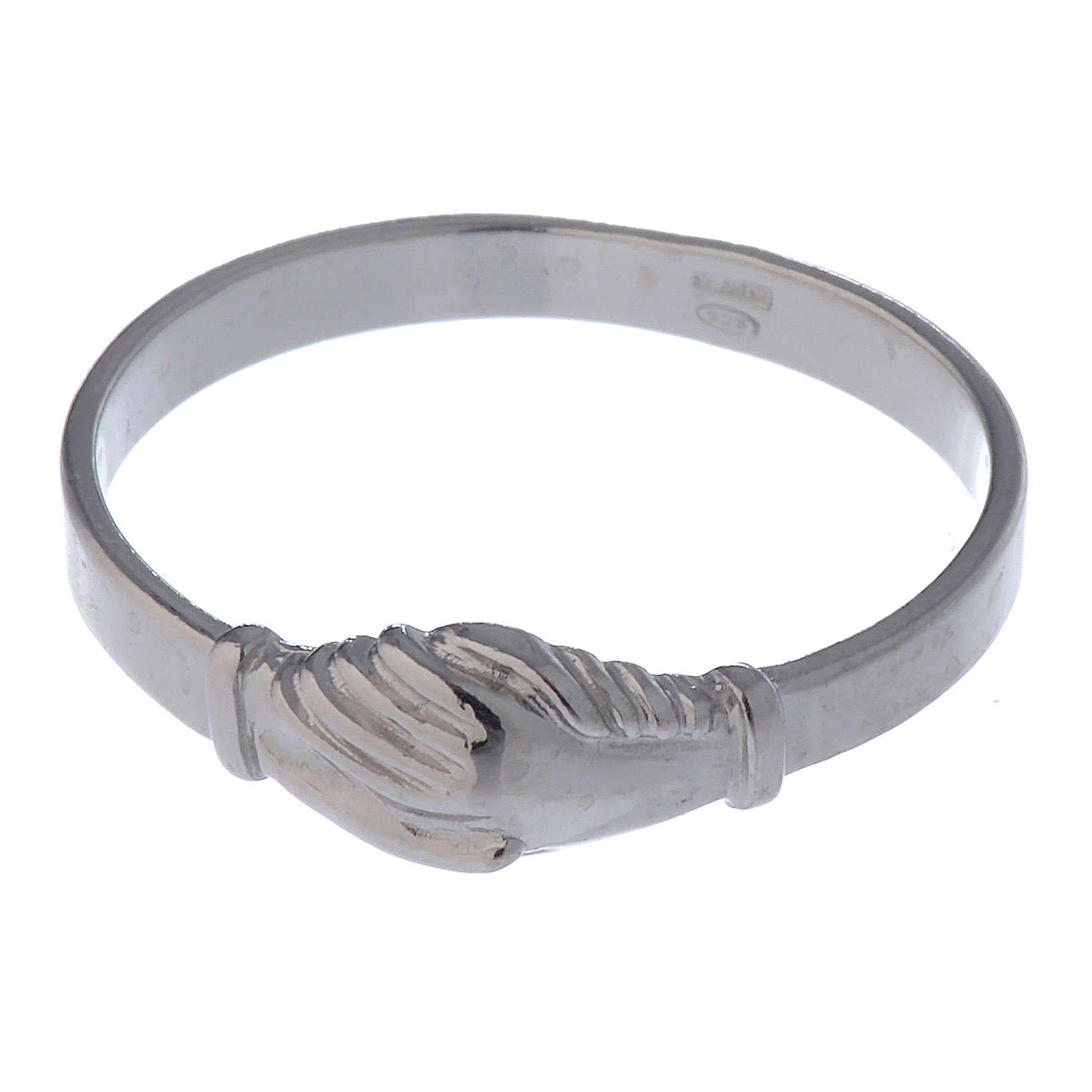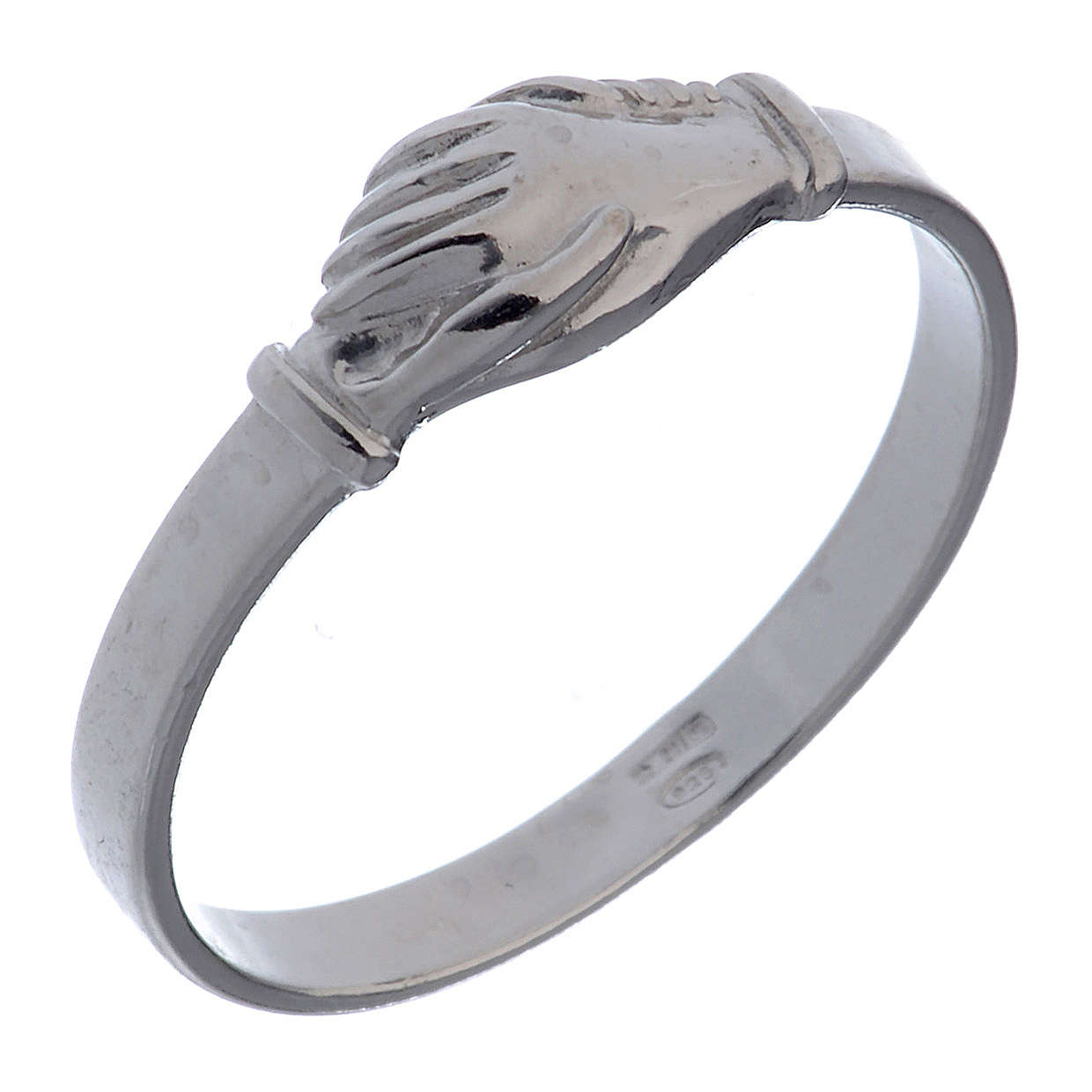 Anel prata 925 Santa Rita. Anel em prata 925 com mãos apertadas: anel de casamento de Santa Rita, símbolo do valor profundo da fidelidade no amor verdadeiro.