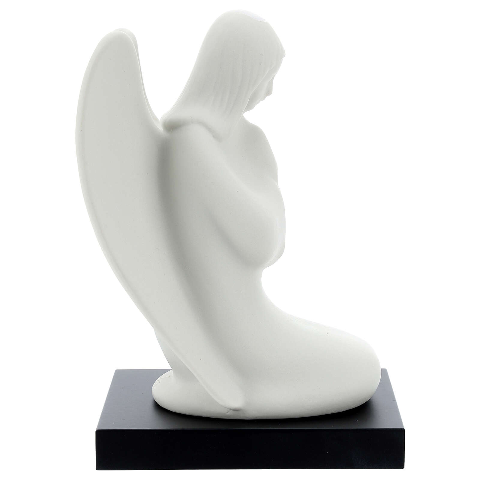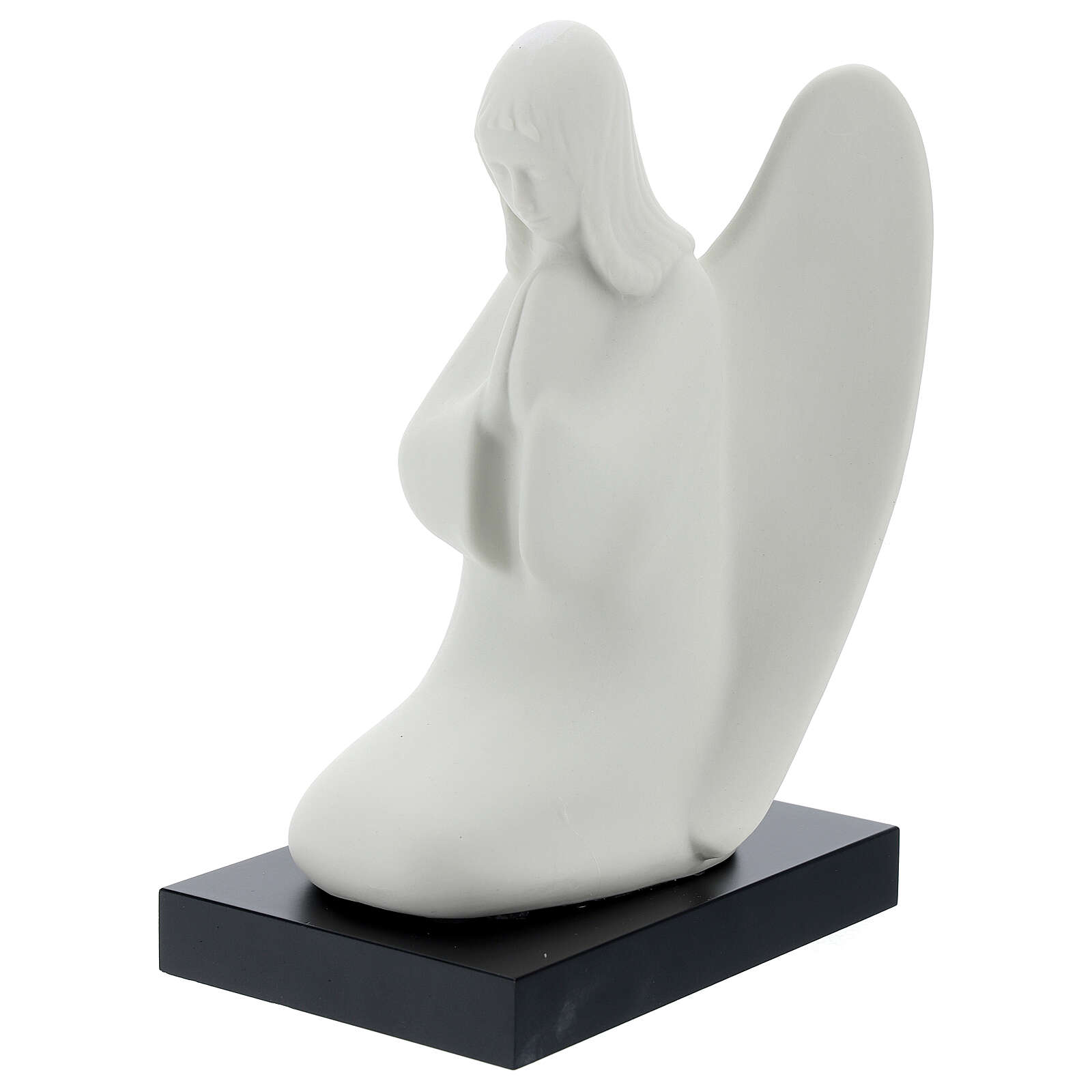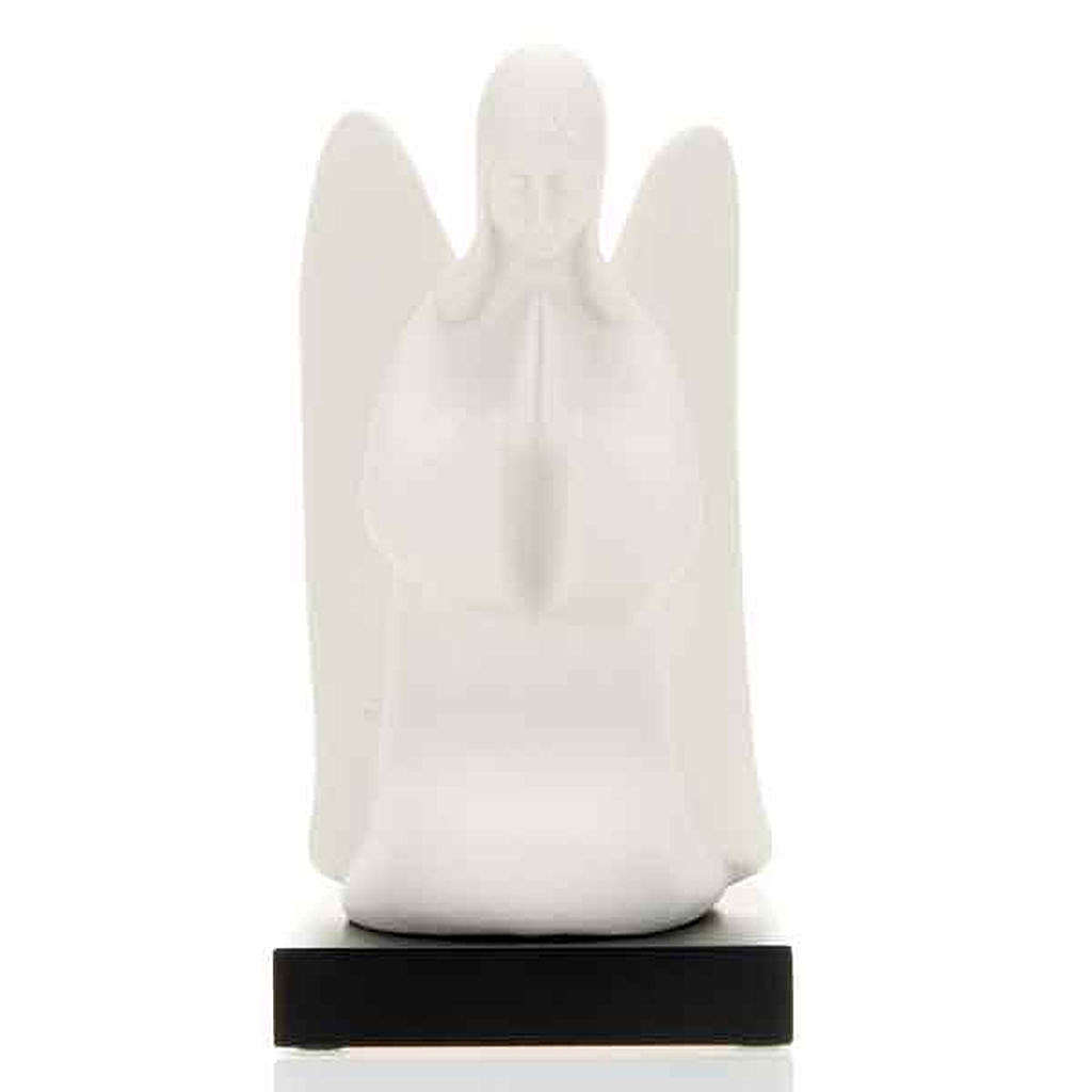 Anjo da guarda de joelhos. Estatueta em porcelana representando o anjo da guarda a rezar sobre base em madeira, realizada e acabada à mão pelo artista italiano Francesco Pinton.