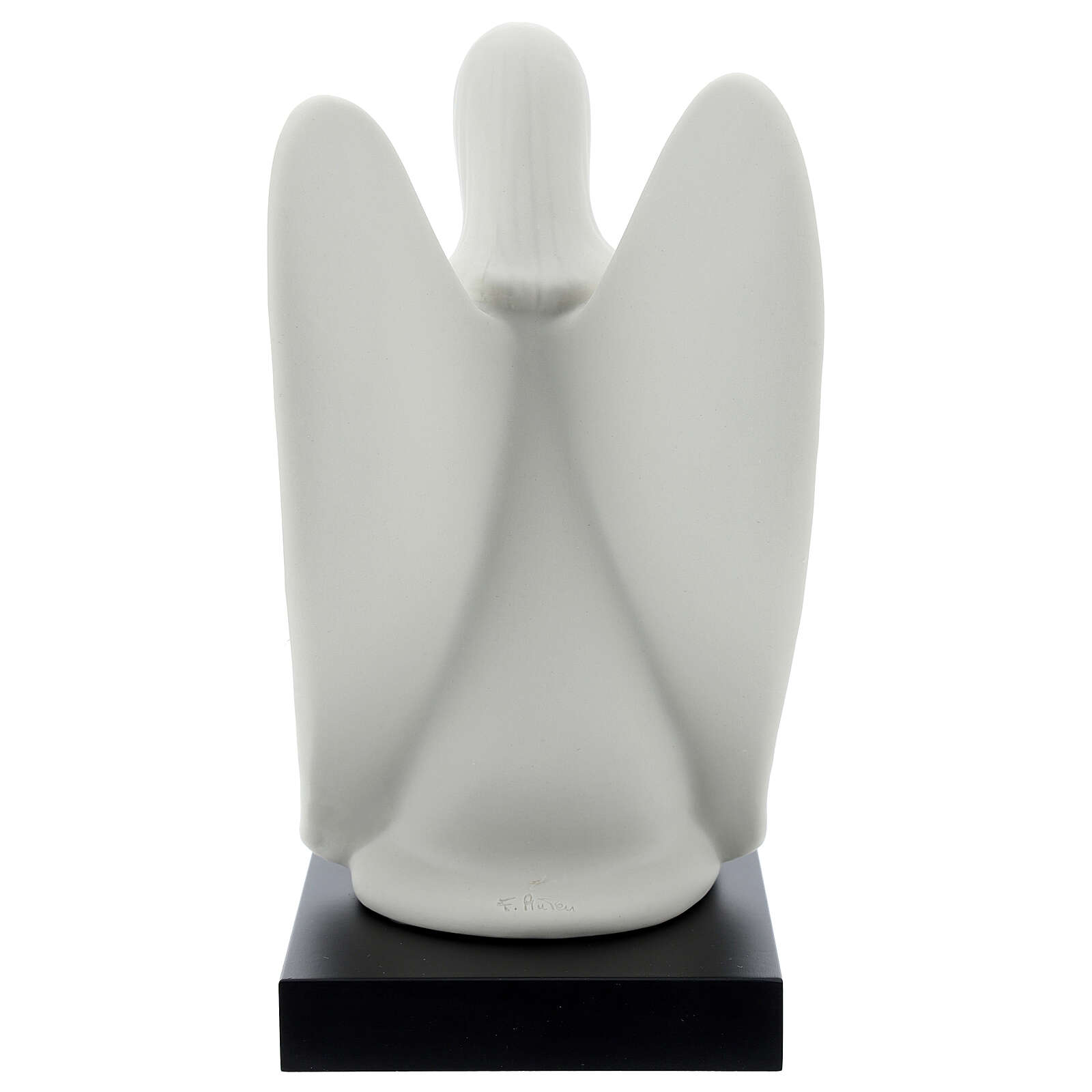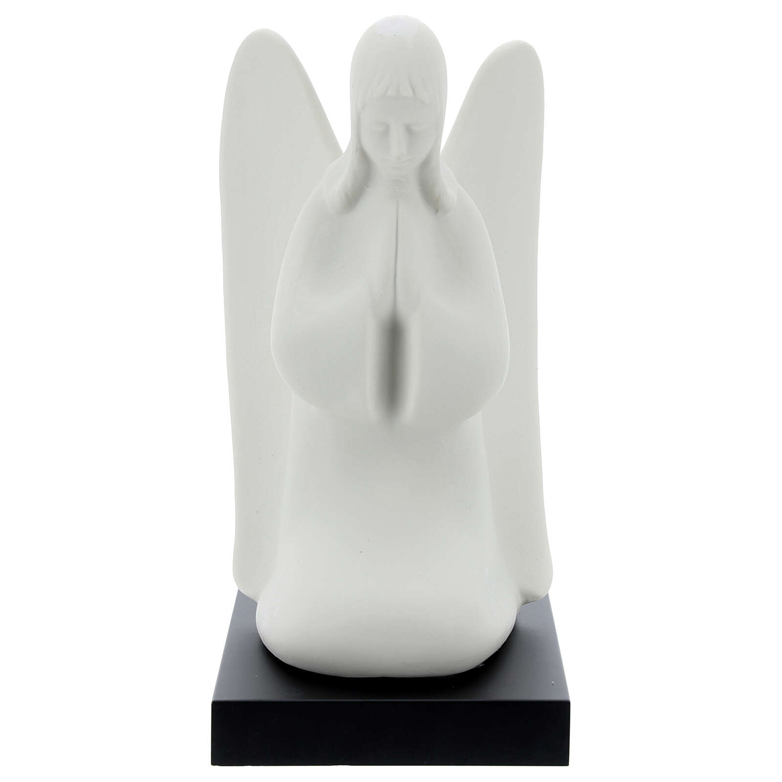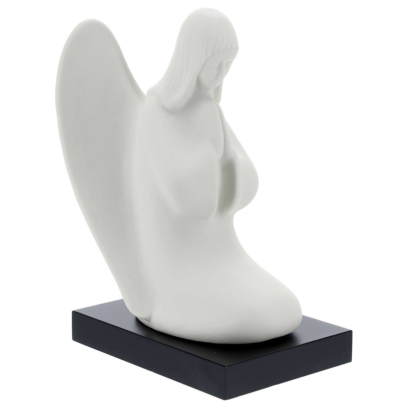 Anjo da guarda de joelhos. Estatueta em porcelana representando o anjo da guarda a rezar sobre base em madeira, realizada e acabada à mão pelo artista italiano Francesco Pinton.