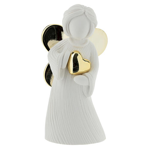 Estatueta em resina opaca representando um anjo estilizado segurando um coração. As asas e o coração com acabamento brilhante em efeito espelho dourado conferem reflexos quentes e luminosos à peça.