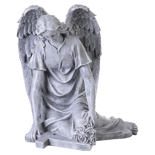 Anjo ajoelhado para exterior com cruz e flores 40 cm acabamento efeito pedra.