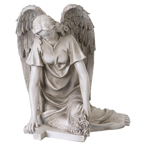 Anjo ajoelhado para exterior com cruz e flores 40 cm acabamento efeito pedra antiga