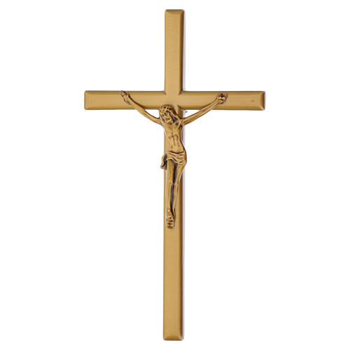 Crucifixo de parede com acabamento em bronze, de linhas simples e formato de cruz latina com bordas abauladas, enriquecido por uma réplica do corpo de Cristo em bronze.