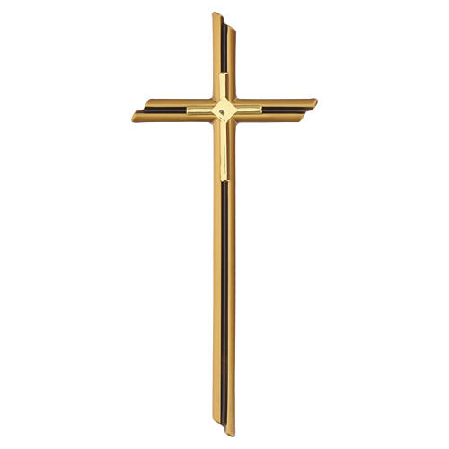 Cruz de parede em acabamento bronze composta por estrutura principal e cruz interna sobreposta, com elemento dourado aplicado na zona central.