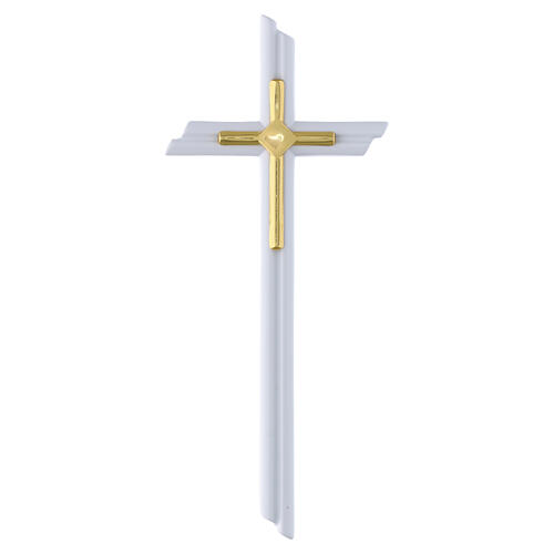 Cruz destinada à fixação mural com acabamento totalmente branco, composta por corpo principal ortogonal e elemento central em forma de cruz com acabamento dourado.