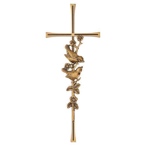 Cruz bronzeada para montagem em parede, adequada ao uso exterior e protegida por uma pátina especial contra as intempéries. Esta cruz latina clássica é enriquecida por uma aplicação em relevo que representa um ramo florido onde repousam dois delicados passarinhos.