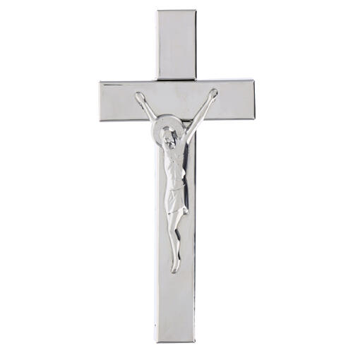 Cruz de parede com a figura do Cristo integrada, concebida em aço para instalações comemorativas em superfícies verticais.