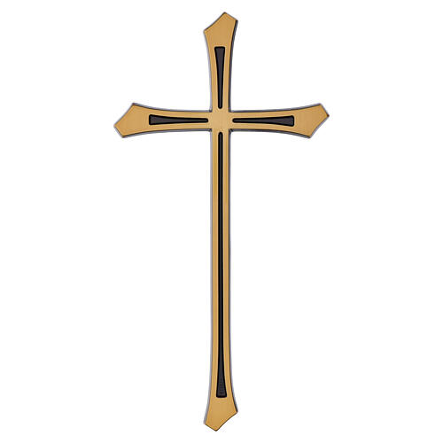 Cruz de parede de desenvolvimento vertical alongado e corpo contínuo, caracterizada por molduras nos terminais dos braços e na haste central.