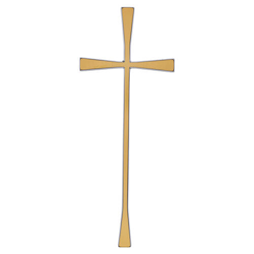 Cruz de parede com desenvolvimento vertical alongado e corpo contínuo, com acabamento bronze em toda a superfície.