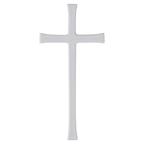 Cruz latina em porcelana branca com acabamento brilhante, de estilo sóbrio e elegante. Esta cruz é ideal para a decoração de monumentos, lápides e nichos, sendo adequada para instalação em espaços exteriores.