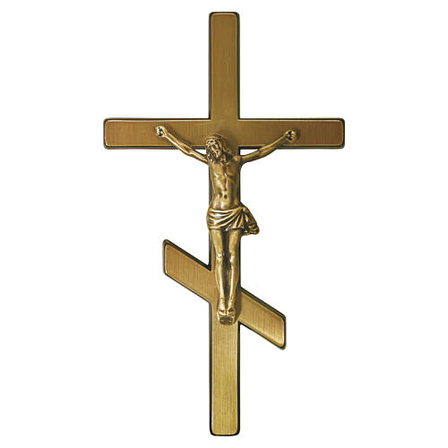 Crucifixo Ortodoxo para colocações exteriores com acabamento em bronze e corpo de Cristo em relevo num estilo clássico.