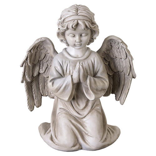 Estátua de querubim ajoelhado para exterior 40 cm efeito pedra patinada.