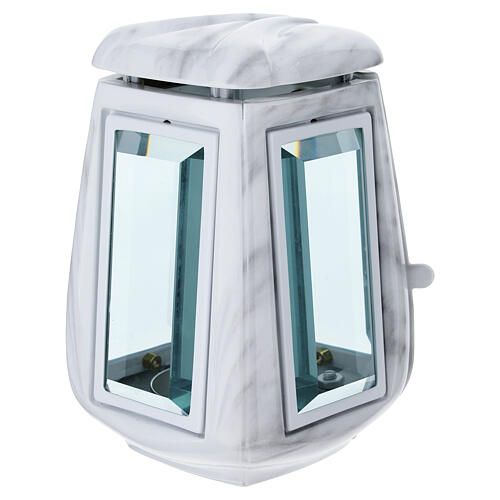 Lâmpada para velas realizada em latão com acabamento que reproduz o mármore de Carrara, concebida para a iluminação votiva de áreas funerárias exteriores e para o adorno de sepulturas e monumentos.