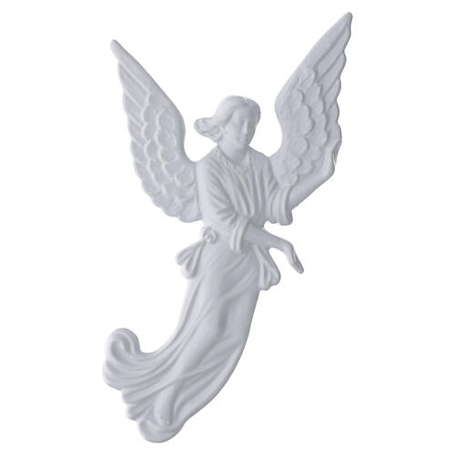 Placa de parede em alto-relevo que representa um anjo em voo, com asas abertas e sugestão de movimento ascensional, acabamento branco uniforme e modelação definida das superfícies.