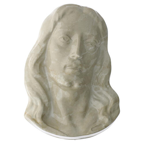Placa de parede em alto-relevo representando o busto de Jesus Cristo, realizada com acabamento efeito mármore Botticino, com superfície uniforme e modelação definida.