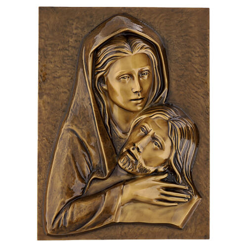 Placa que representa a Pietà destinada à instalação mural em contexto cemiterial, realizada em metal com acabamento em bronze e estrutura maciça. A composição apresenta um relevo figurativo com a Virgem Maria a sustentar o corpo de Cristo, modelado em baixo-relevo sobre um fundo retangular uniforme com bordas perimetrais definidas.