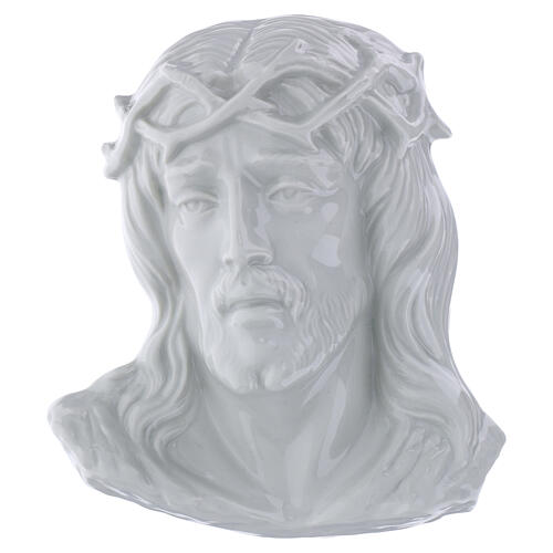 Placa que representa o rosto de Cristo com coroa de espinhos, concebida para aplicação em parede e realizada em porcelana branca.