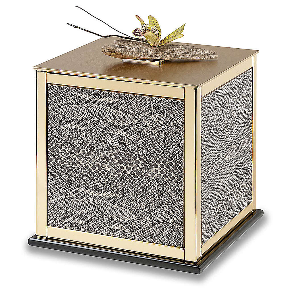 Urna Funerária estilo Lou R. realizada inteiramente na Itália por uma empresa especializada após um estudo minucioso das linhas e do design. Esta elegante urna funerária respeita todas as normas e pode ser colocada seja no cemitério, seja em casa o outros lugares. A estrutura da urna é feita em metal polido com acabado dourado, mentras que as paredes são realizadas em couro ecológico de pitão.A urna inclui uma composição floreal no topo.