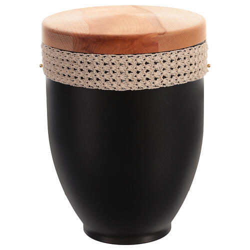 Feita em metal preto fosco com tampa em madeira clara, adornada com uma faixa de crochê em algodão cor areia claro, esta urna é realizada com cuidado artesanal.