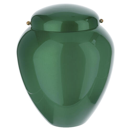 Urna destinada à recolha das cinzas, fabricada em alumínio com acabamento verde metalizado e capacidade interna de 4,5 litros.