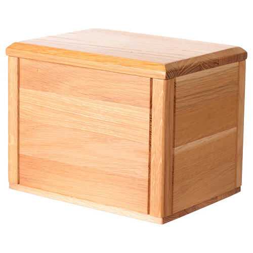 A urna externa é um elegante cubo em madeira clara com dimensões de 20,5 cm de altura, 25,7 cm de profundidade e 19,2 cm de largura.