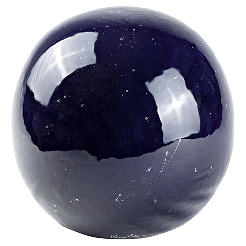 O modelo apresenta forma perfeitamente arredondada, superfície contínua e esmaltação azul intensa, marcada por reflexos luminosos que realçam o volume compacto da esfera.