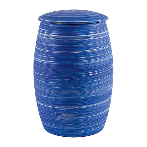 Urna cinerária de design simples, decorada com elegantes linhas horizontais brancas e azuis.