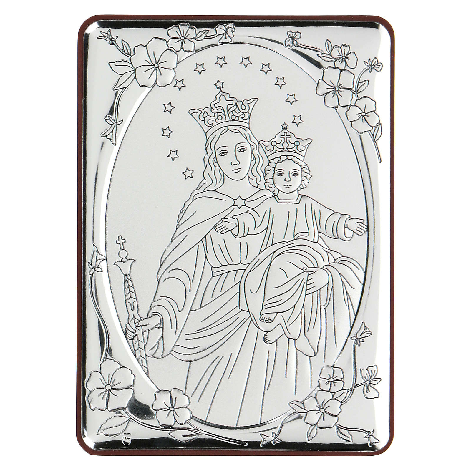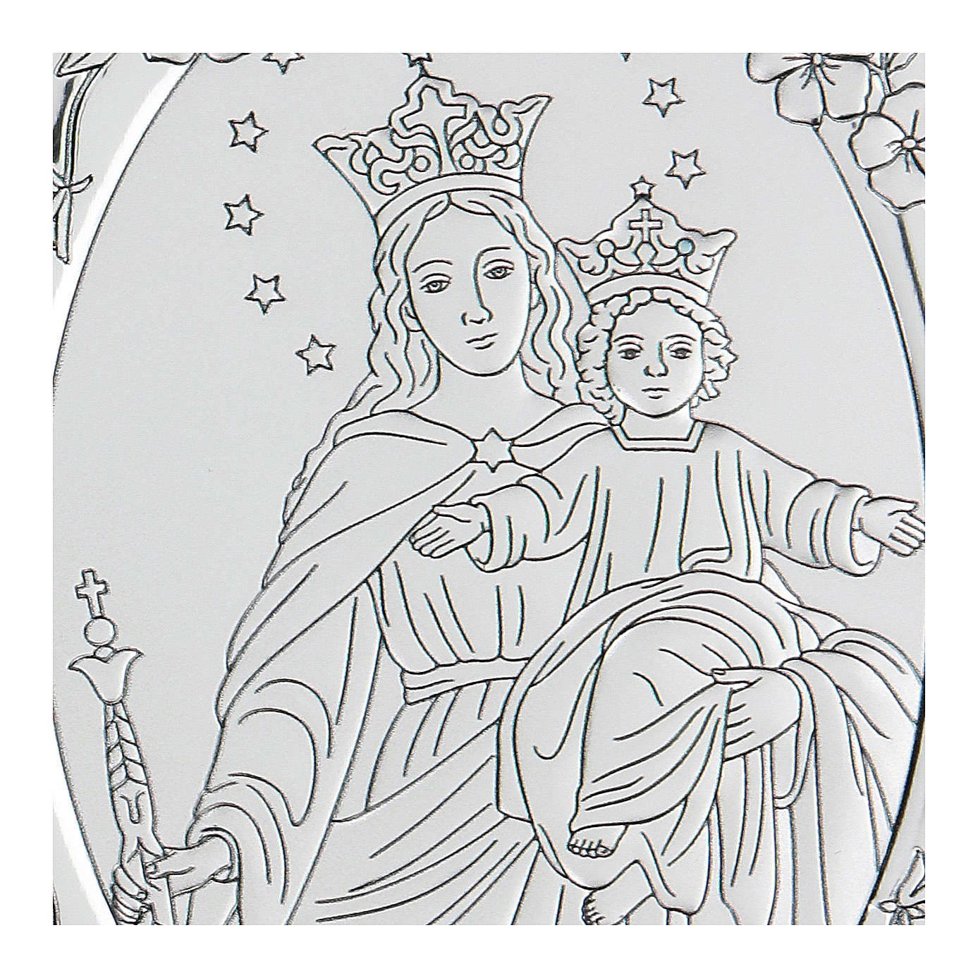 Baixo-relevo bilaminado Maria Auxiliadora 10x7 cm. Artigo realizado e decorado em prata bilamidada com acabamento contra oxidação, de