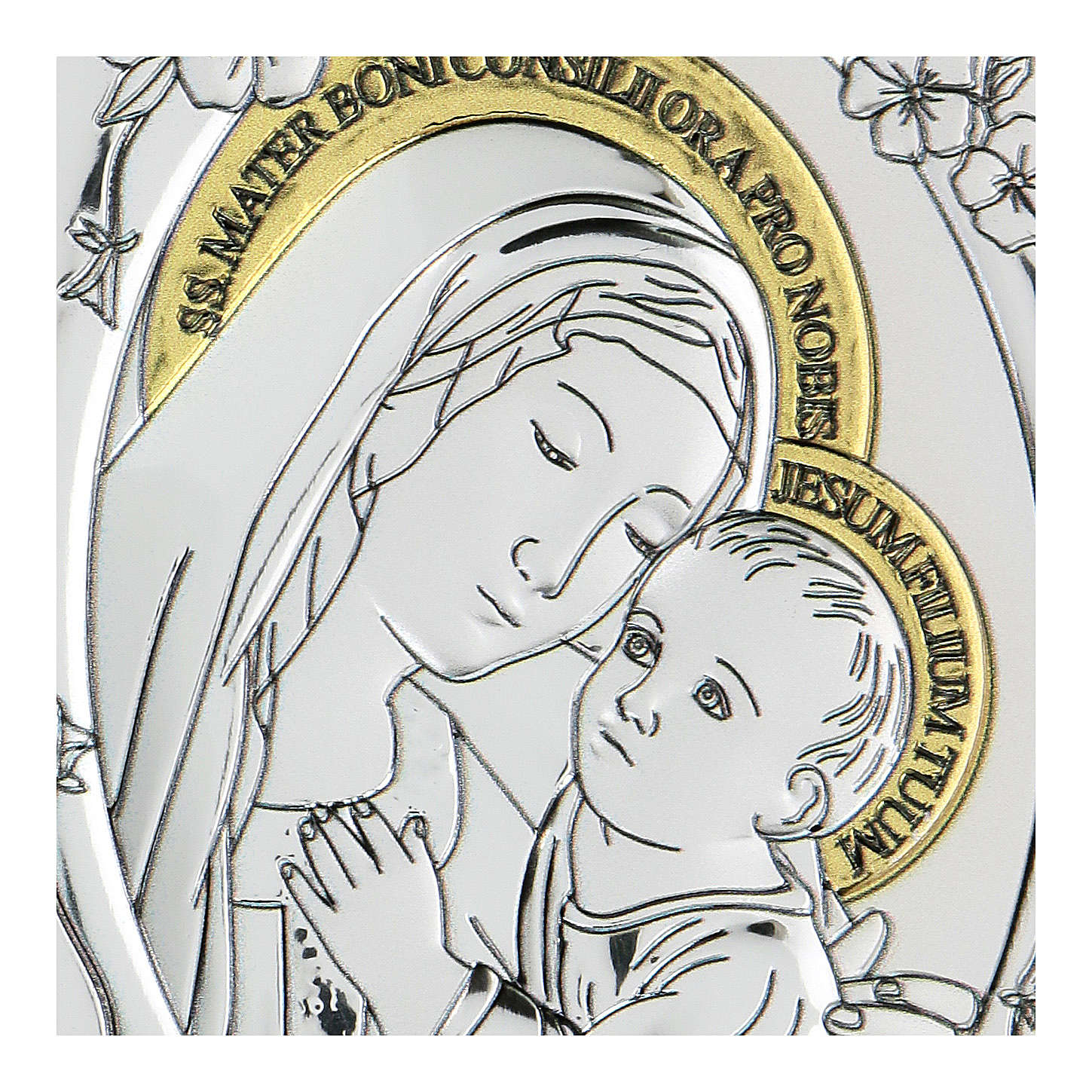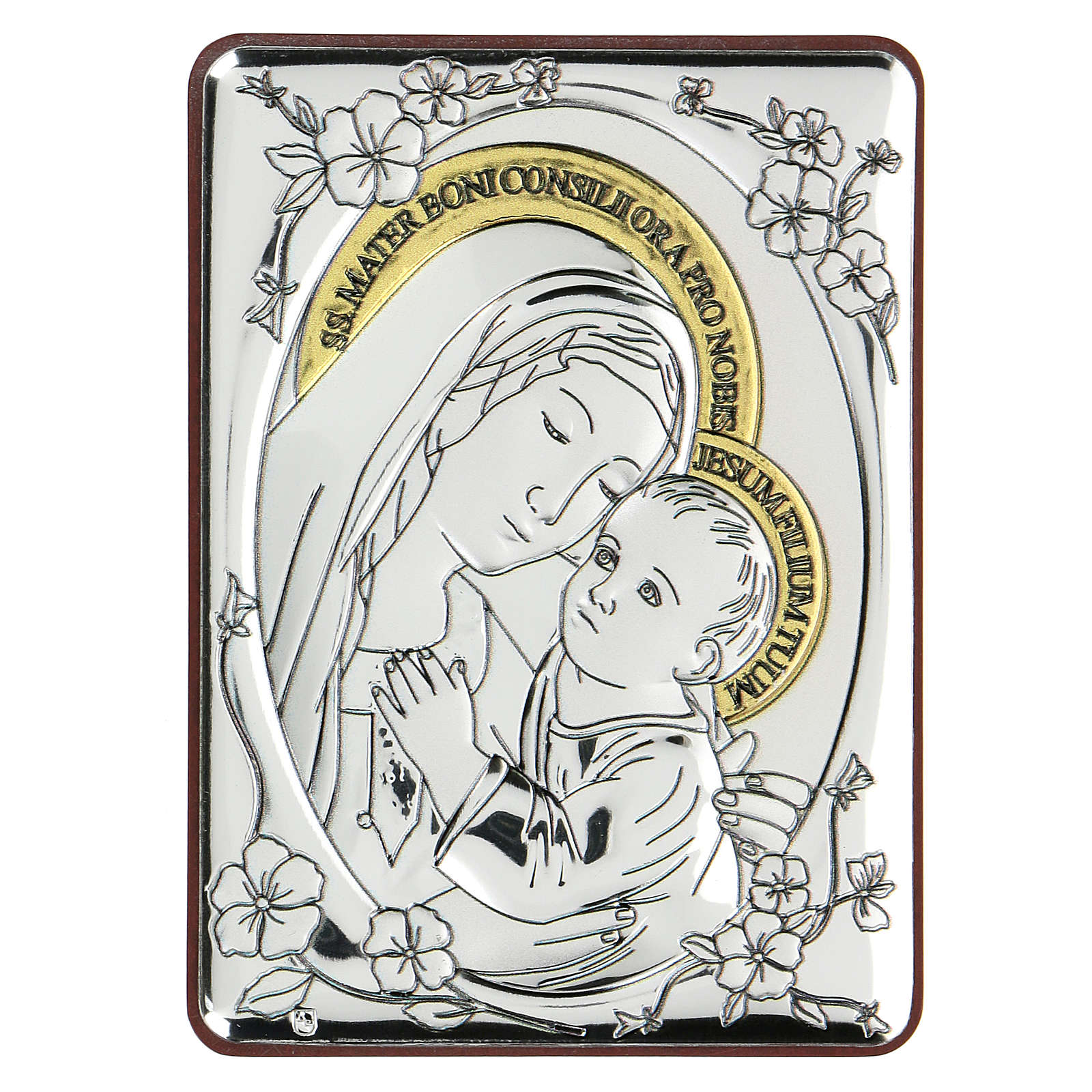 Baixo-relevo bilaminado Nossa Senhora do Bom Conselho 10x7 cm. Artigo realizado e decorado em prata bilamidada com acabamento contra oxidação, de