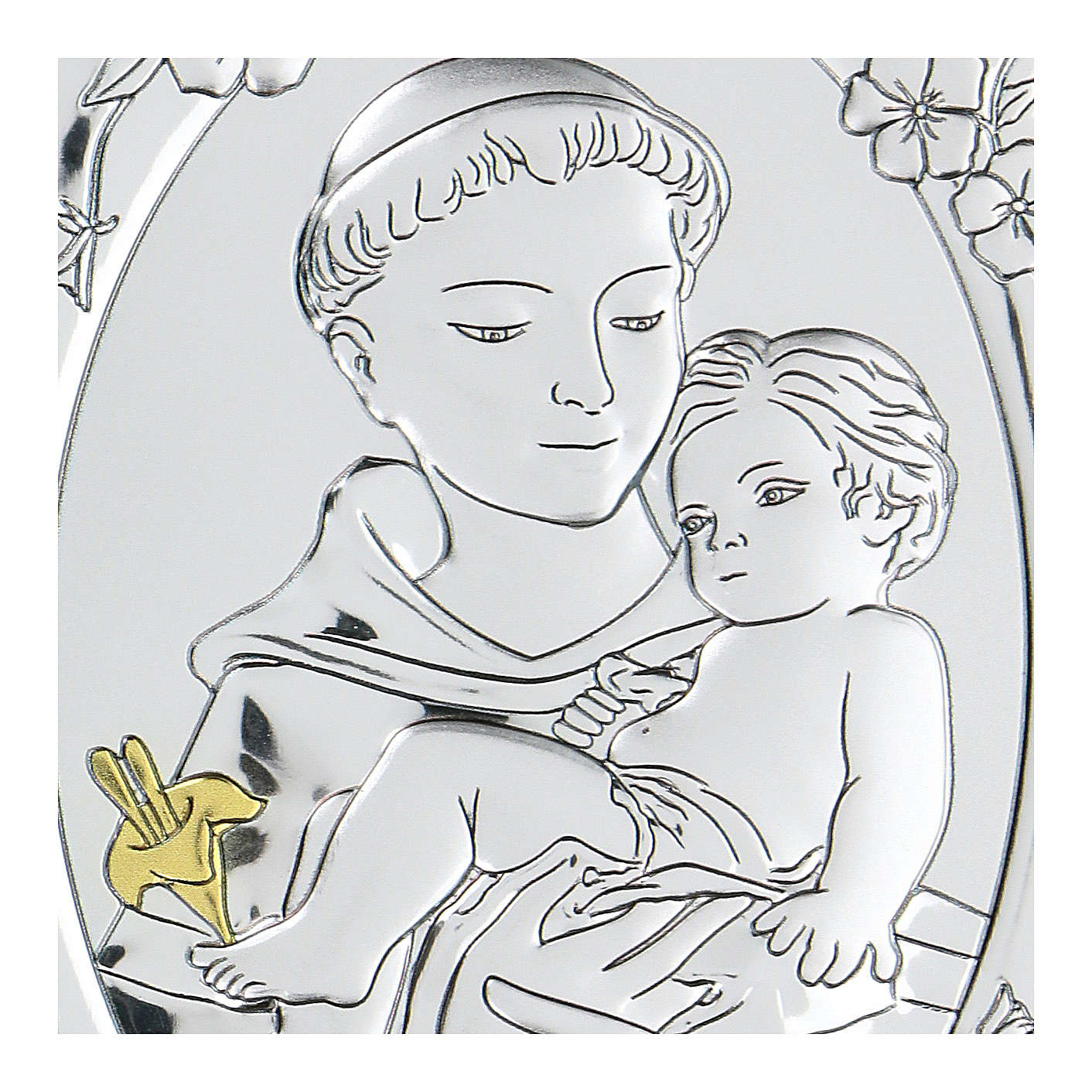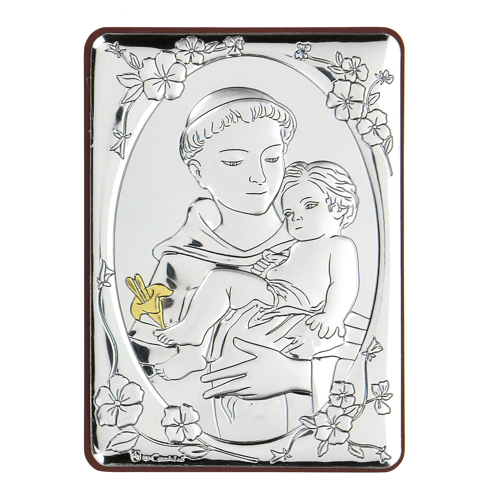 Baixo-relevo bilaminado São António com menino 10x7 cm. Artigo realizado e decorado em prata bilamidada com acabamento contra oxidação, de