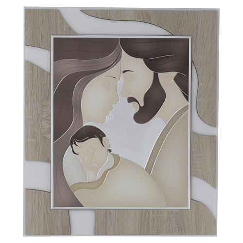 Painel decorativo da Sagrada Família com moldura em prata bilaminada sobre estrutura em madeira, medindo 55x45 cm.