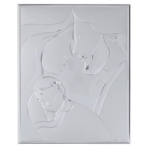 Quadro da Sagrada Família em prata bilaminada sobre estrutura de madeira branca.