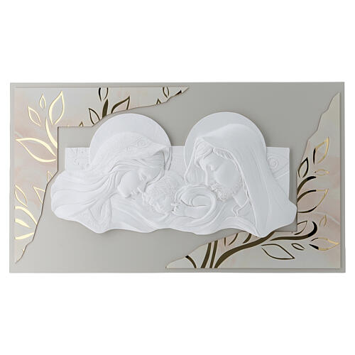 Quadro em baixo-relevo representando a Sagrada Família em estilo moderno, realizado em tons de branco com detalhes em dourado.