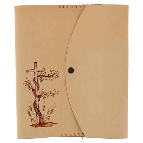 Capa feita em couro claro, cortada e costurada à mão pelos operadores da Cooperativa Social San Giuseppe. Capa adequada para a Bíblia de Jerusalém para o estudo, com fecho de botão de pressão para praticidade ao transportar e proteger sua Bíblia. A decoração foi gravada com um pirografo, retratando a cruz envolta por uma videira com cachos de uva, símbolo significativo de Cristo como verdadeira videira e ligação com a vida espiritual.
