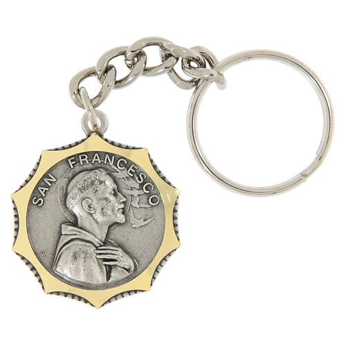 Chaveiro decagonal em latão ouro prataSão Francisco 32 mm. Chaveiro em latão com acabamento bicolor, destacando o contraste entre o prateado fosco e o detalhe em ouro brilhante. No centro, São Francisco de Assis é representado com andorinhas, símbolo de sua conexão com a natureza e espiritualidade franciscana. O design em forma de decágono proporciona um toque distintivo, tornando-o um objeto precioso e simbólico. Artigo fabricado em uma das renomadas fundições de arte italiana, especializada no trabalho com metais sagrados. Com uma longa tradição, essa fundição passa adiante de geração em geração sua habilidade artesanal, criando obras de alta qualidade com técnicas refinadas e materiais de alto padrão.