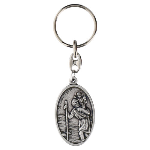 Chaveiro religioso com medalha oval em zamak prateado de 4,5x2,5 cm, representando São Cristóvão no anverso e mãos postas em oração no reverso.