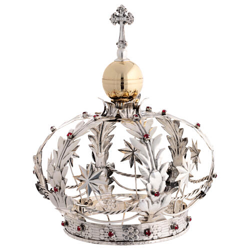 Ideal para enriquecer as imagens da Nossa Senhora com estilo real e efeito de filigrana, esta coroa é adornada com estrelas e pedras vermelhas decorativas.