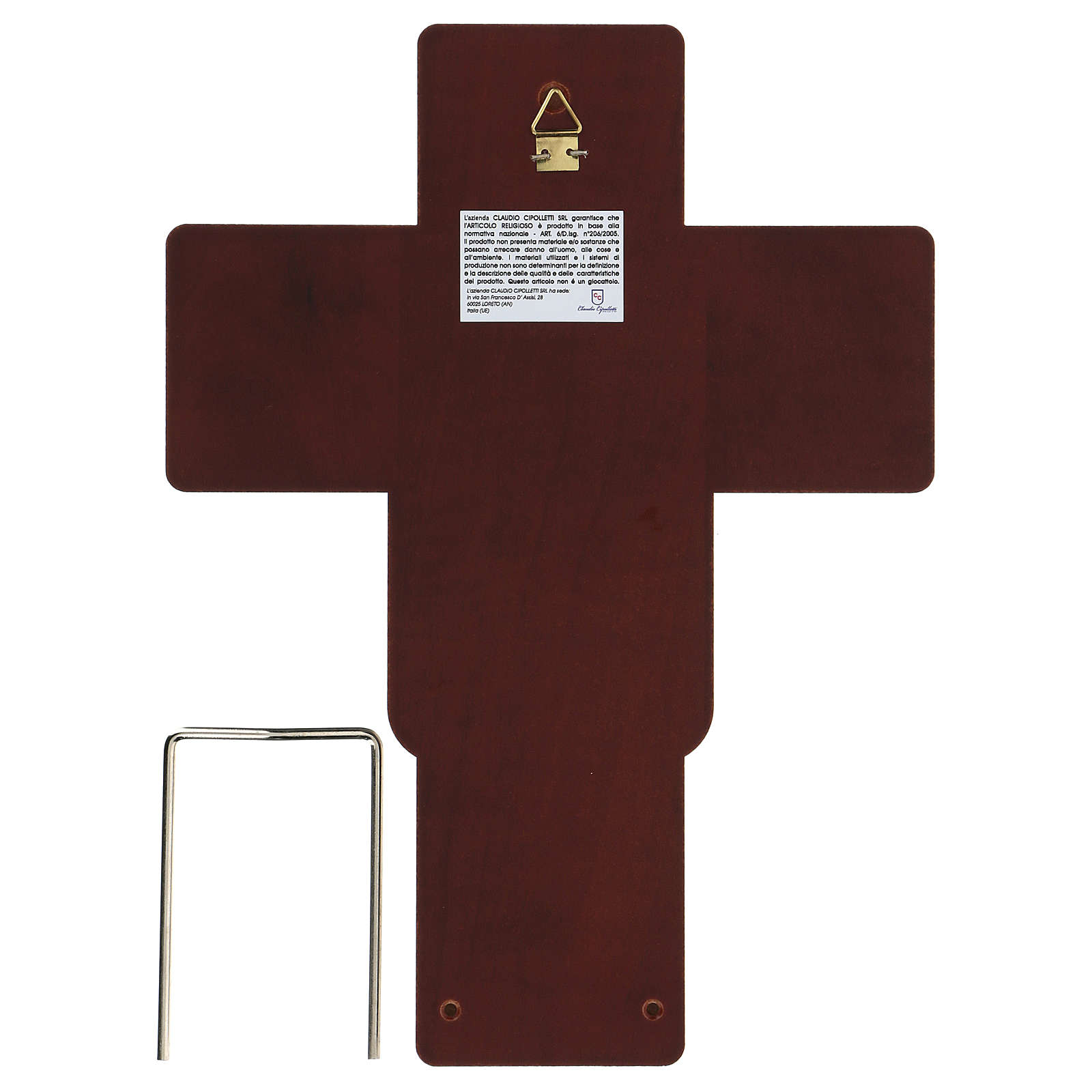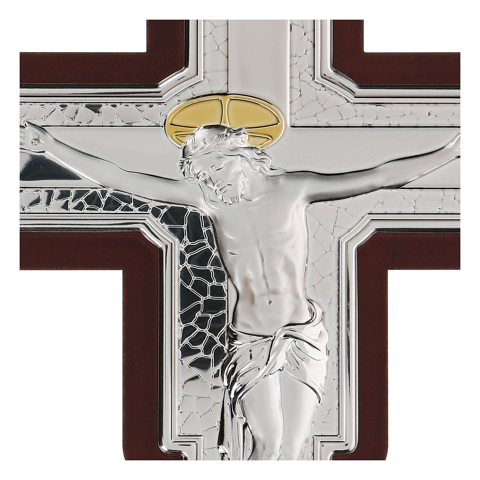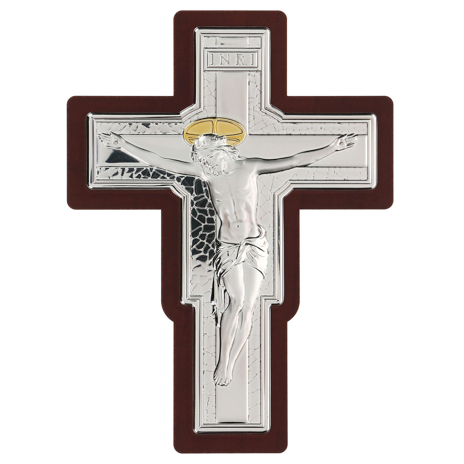 Crucifixo bilaminado em baixo-relevo 25x19 cm. Crucifixo em madeira com placa em prata bilaminada decorada em baixo-relevo com acabamento contra oxidação, de superfície brilhante e acetinada. Modelo para pendurar ou pôr na mesa, entregado com certificado de garantia.