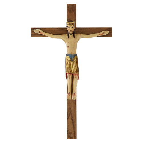 A coroa dourada em vez da coroa de espinhos indica a dignidade real e sacerdotal desta representação. Nesta reprodução nota-se a influência italiana de Arezzo.