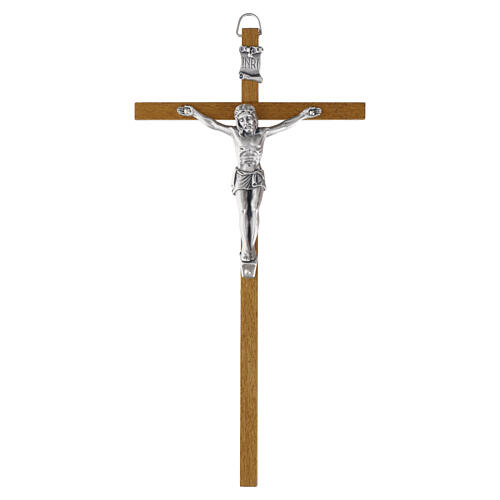 Cruz de madeira clara para parede 25x15 cm com Cristo em metal.