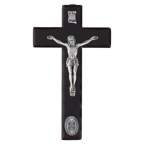 Cruz de parede em madeira escura com acabamento brilhante, decorada com corpo de Cristo e medalha oval de São Bento em zamak prateado.
