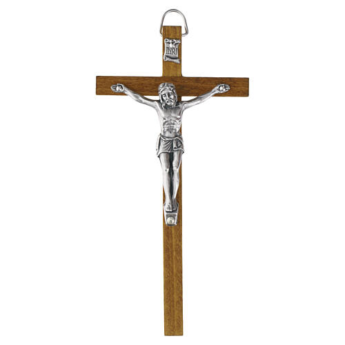 Cruz de parede em madeira clara com acabamento opaco, equipada com gancho superior para fixação na parede e com figura do Cristo em zamak prateado aplicada ao centro.