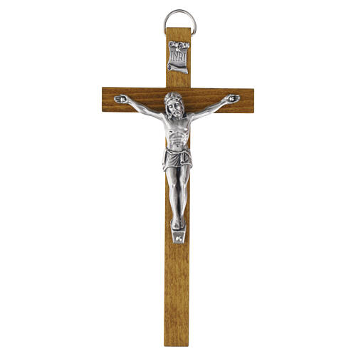 Cruz em madeira clara com acabamento liso, com o corpo de Cristo em liga metálica prateada aplicado em relevo.