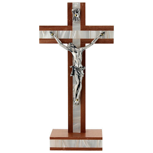 Crucifixo de mesa em madeira cor mogno. Crucifixo de mesa em madeira cor mogno com parte central em policarbonato imitação de madrepérola e corpo de Cristo prateado, pregado com pregos dourados.