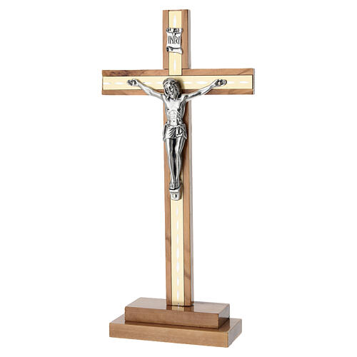 Cruz de mesa 25x10 cm em madeira de oliveira com aplicações douradas e Cristo em zamak