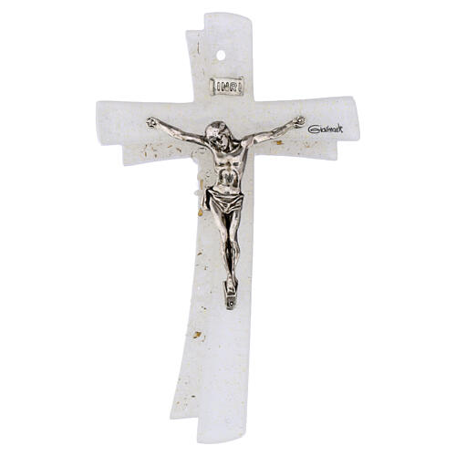 Crucifixo vidro Murano 16 cm dourado com strass. Crucifixo inteiramente manufacturado na Itália em vidro de Murano com cruz dupla de 16x10 cm de vidro transparente com fundo branco, brilhantes dourados e strass. O corpo de Cristo e a escrita INRI são prateado, enquanto a coroa de espinhos e o pano são dourados.
