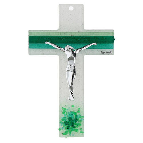 Cruz branca verde vidro de Murano 16x10 cm corpo prateado