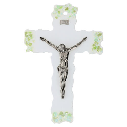 Cruz de parede em vidro de Murano com superfície branca, inserções verdes e figura central em metal prateado.