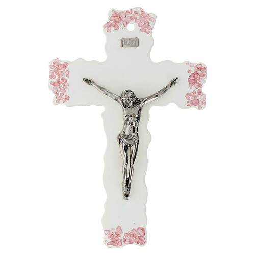 Cruz decorativa de parede com fundo branco e fragmentos de vidro de Murano cor-de-rosa, apresentando o corpo central de Cristo em zamak.